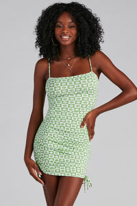 Look like a treat this St. Patrick's Day! This sleeveless mini dress features an on-trend square neck, spaghetti straps, and dual side ruching with adjustable ties, a shamrock pattern, and a bodycon silhouette. Composed of a brushed knit fabric with a moderate stretch. Finish the look in strappy sandals.