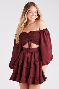 Keep it so sweet with a charming ruffled skater dress! The dress features an off-the-shoulder neckline, a smocked bodice with a ruched drawstring, long sleeves, a sexy cutout at the midriff, and a tiered ruffled skater silhouette. The dress is composed of a lightweight gauze knit fabric that offers a relaxed fit with minimal stretch. Complete look with sandals.