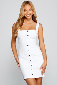 Keep your everyday look cute and casual in this must-have denim dress! It features a sleeveless square neckline, thin shoulder straps, a complete button-down front, and a short, curve-hugging silhouette. Style this dress with sneakers and chic shades.