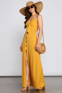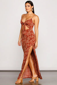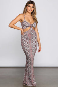 Channel a carefree vibe with a maxi dress that is so bohemian chic! The dress features a bohemian print, a sleeveless V-neckline, spaghetti straps, dual cutouts at the waist, and a maxi-length silhouette. The dress is composed of a smooth knit fabric that offers a form-hugging fit. Complete look with sandals and tassel earrings.