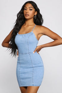 Keep it dreamy with a denim mini dress that elevates your look! The dress features a sleeveless scoop neckline, spaghetti straps that lead to a lace-up back, vertical seams, and a mini-length silhouette. The dress is composed of a denim fabric that offers a form-hugging fit with a moderate stretch. Complete look with mules.