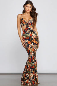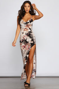 Get carried away in this tropical maxi dress that will have you ready for that cabana life! The dress features a tropical floral print, a sleeveless V-neckline, a double row of spaghetti straps that cross at the back, a lace-up back, and a maxi-length silhouette with a high side slit. The dress is composed of a smooth knit fabric that offers a form hugging fit with a moderate stretch. Complete look with sandals and hoops.