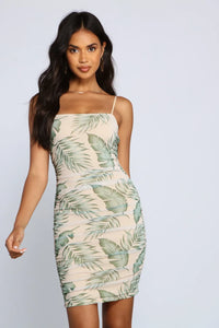Get ready for your island getaway in this adorable mesh mini dress! It features a sleeveless square neckline, adjustable spaghetti straps, ruched detailing, a short, curve-hugging silhouette, and an all-over tropical palm leaf print. Style this dress with strappy sandals.