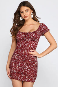 Keep your look fresh and fab in this adorable floral printed mini dress! It features a sweetheart neckline with a tie at the bust, short puff sleeves, and a short, curve-hugging silhouette. Style this dress with strappy sandals and chic sunnies.