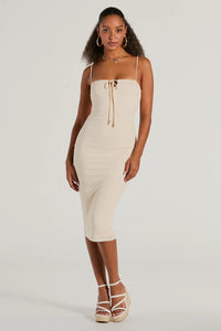 Have your trending moment in this midi dress! It's designed to hug your curves in a bodycon silhouette while the front lace-up adds a playful touch to your day or night look.
