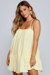 Get an effortless look in this flowy boho-chic mini dress. It features a sleeveless subtle square neckline, adjustable spaghetti straps that lead to a cross-back design, a short A-line silhouette, and a drop hem with a cute ruffle detail. Style this dress with your fave pair of wedges.