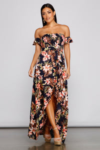 Your dream vacation is calling! Pack this stunning tropical floral printed maxi dress for a gorgeous look. It features an off-the-shoulder square neckline, a fitted smocked bodice, short ruffled sleeves, a tie-front accent to highlight the waist, and a flowy, floor-length silhouette with a wrap-front design. Style this dress with sleek hoop earrings and strappy sandals.
