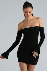 Show off your curves in this sexy mini dress for weekend outings! The short dress features an off-the-shoulder neckline with a flirty bust keyhole tie, long sleeves with flared cuffs, side ruched seams to accentuate your figure, a bodycon silhouette, and a mini-length hem. Complete the look in lace-up stiletto heels and dare to be bold!
