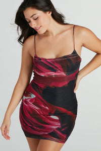 Play up your artsy side in this mesh mini dress totally giving those Y2K vibes! The mini dress features fitted long sleeves with split cuffs, a mock neckline, and a bodycon silhouette on mesh abstract printed fabric with a sheer mesh stretchy lining. Complete the look in chunky platform heels for a party!