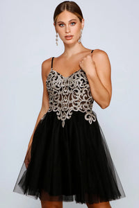 Make a stunning impression with a formal dress that impresses with luxe details! Juniper features a sleeveless V-neckline with padded cups, adjustable spaghetti straps, a partially lined bodice, a gorge embroidered filigree design accented with rhinestones, and a tulle mesh party length silhouette. The dress is composed of a partially lined tulle mesh fabric that offers a form hugging fit with minimal stretch. Complete look with rhinestone heels and a satin clutch.