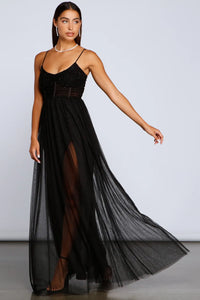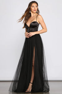 Vampy and chic, the Bria dress will give your formal look a sultry style. She features a sleeveless bodice, a corset-designed top with a sweetheart neckline, adjustable spaghetti straps, and a back zipper closure. Her high waist flows out to a floor-length sheer mesh tulle skirt and a lining with a sexy thigh-high front slit. Complete your look with sleek statement earrings.