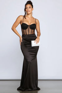 Step out in style in the sultry-chic Rachel formal dress! She features a sleeveless sweetheart neckline, adjustable spaghetti straps, and a sheer illusion corset-designed bodice with all-over rhinestone detailing. Her flattering high waist flows out to a floor-length sheer mesh skirt with a lining featuring a thigh-high side slit. Complete the look with a luxe rhinestone necklace.