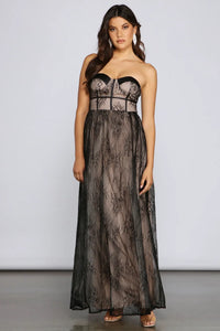 Part sultry, part glam, the Laurel dress elevates your formal evening outfit. She features a sleeveless sweetheart neckline with removable adjustable spaghetti straps, padded cups, a corset-like bodice with piping accents, and an A-line silhouette. She stands out with a two-tone lace illusion accented with a knit lining and tulle. Complete look with heels and faux leather clutch.