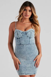 Stun like the style icon you are with a mini dress that stuns! The dress features a sleeveless sweetheart neckline, lightly padded cups, adjustable spaghetti straps, corset-like seams at the bodice, and a mini-length silhouette. The dress is composed of a denim fabric that offers a form hugging fit with a moderate stretch. Complete look with mules.