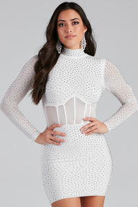 Step out with a formal dress that enchants with stunning details for your formal event. Renata features a mock neck, long sleeves, a sheer illusion waist with flexible boning, sparkling heat stones throughout, and a mini-length silhouette. The dress is composed of a partially lined mesh fabric that offers a form-hugging fit with a moderate stretch. Complete look with door knocker earrings.