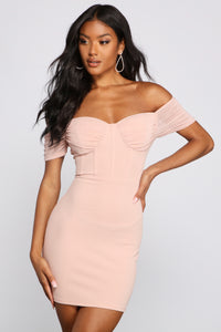 Stay sweet and stylish this season in this adorable mini dress! It features an off-the-shoulder sweetheart neckline, sheer short sleeves, a corset-designed front, and a short, curve-hugging silhouette. Complete the look with clear heels.