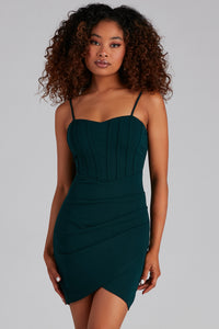 Showcase your beauty in this chic of-the-moment mini dress. It features a sleeveless sweetheart neckline, spaghetti straps, a corset-designed bodice, and a mini-length, curve-hugging silhouette with a wrap-front skirt. Style this dress with a rhinestone necklace and strappy heels.