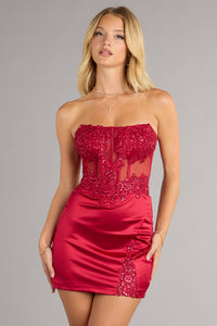 Effortlessly glamorous, the Alexia satin mini dress features a strapless corset bodice with delicate lace and beaded trim at the bust and a sculpted fit that moves with you. The lace-up back and knotted accent create a perfect mix of structure and romance.