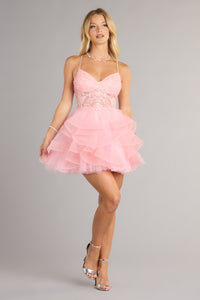 Made to steal every spotlight, the Katy tulle mini dress stuns with a plunging lace bodice and tiered beaded skirt that moves with your every step. A halter neckline and sheer corset-style waist add the perfect mix of drama and polish.