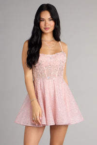 Made for twirls that steal the spotlight, the Athena short dress enchants with a glitter tulle skater silhouette and a delicately beaded corset bodice. A lace-up back completes the look with an effortlessly romantic finish.