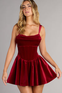Decadent and daring, the Kyla velvet corset skater dress is made for entrances that stop the room. With its sculpted bodice, open back, and twirl-ready skirt, it delivers luxe drama for making an entrance.