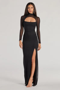 Serve chic style at your next formal affair in the Veda dress designed with lined knit fabric offering a smooth look with plenty of stretch. It features a crew neckline with a chic twist-front accent, a sultry cutout above the bust, long fitted sleeves, a bold open back that will turn heads, and a high-cut front slit along the floor-length fitted column silhouette.