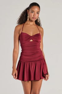This adorable skater dress features a sleeveless sweetheart neckline with a trendy twist-front design, a small keyhole cutout below the bust, and halter tie-back straps leading to a partially open back. The ruching at the drop waist will showcase your curves, while the short skater silhouette adds that flirty flair.