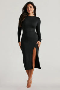 This midi dress may just become that special staple piece in your lineup! It features fitted long sleeves, a crew neck with a button-back closure and keyhole accent, a flattering bodycon silhouette and front slit, and a flirty cutout back design. Complete the look with statement earrings for a cocktail hour.