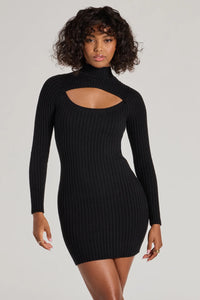 Comfy meets chic in this adorable ribbed knit mini dress featuring a mock neckline, long fitted sleeves, a bold cutout above the bust, and a short bodycon silhouette. Style with knee-high boots.