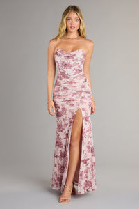 The Rylee floral mesh gown skims your curves with artful ruching and a daring thigh-high slit. The strapless neckline and mermaid silhouette make it a flawless pick for any occasion where the dress code is “unforgettable.”