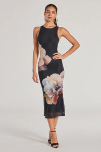 Create a chic look for date night in this lightweight mesh midi dress accented with a gorgeous big floral print pattern. It features a crew neckline, tank shoulder straps, and a slim-fit silhouette to showcase your curves.