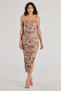 Create an enchantingly chic party look in this lined mesh midi dress accented with a soft floral print and shimmering foiled outline. It features a sleeveless square neckline, spaghetti straps, ruched seams to accentuate your curves, and a midi-length bodycon silhouette detailed with a high-cut side slit.