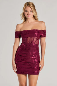 Catch all the glances in this alluring corset mini dress designed with a sheer knit fabric with a partial lining and a foiled floral pattern for a chic feminine look. The short dress features an off-the-shoulder neckline with short sleeve cuffs, a sheer corset-style bodice with contrast piping and flexible boning, and ruched side and back seams to accentuate your stunning curves along the bodycon silhouette.
