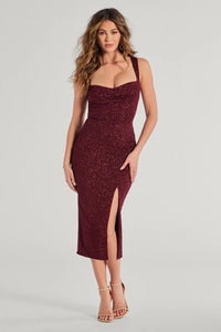 Chic and glam, the Arlette formal midi dress designed with shimmering glitter knit fabric will glitz up your cocktail party. It features a sleeveless sweetheart neckline with a built-in padded bust and a cowl draped overlay, thin tank straps, an open lace-up strappy back design for a customized fit, and a midi-length bodycon silhouette accented with a high front slit.