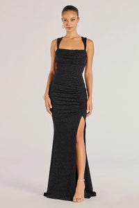 Look your best for a fancy night in the stunning Amirah formal glitter dress! Fashioned with an eye-catching cross back, this dress will make you feel like the star of the evening with a high slit and floor-length column silhouette.