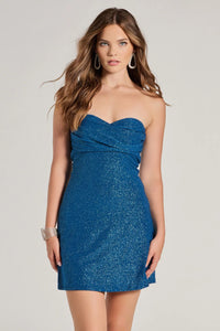 Glow on in a glitter mini dress that brings the glam on your night out! The dress features a strapless sweetheart neckline with ruching and a mini-length hem. Complete the look with platform heels!