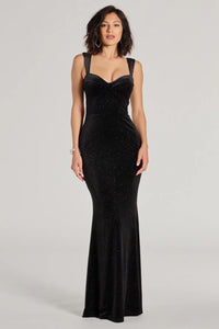 Shimmer in the elegant Veronica velvet formal dress at black tie parties and celebrations. The formal dress is designed with a structured sweetheart neckline and a striking mermaid floor-length silhouette. Pair with earrings and heels.