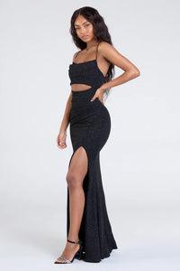Outshine every guest in the Harlow glitter formal dress designed in a sparkling form-hugging silhouette with a sexy cutout and high slit to flaunt your best self!