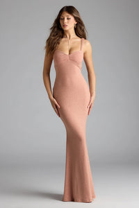 Bring luxe glamour to your formal affair in the Perry glitter knit mermaid dress that radiates an elegant shine. The floor-sweeping silhouette features a ruched wrap-front with a high slit for added allure.