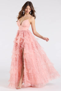 Live out your fairytale dream in the Amabella glitter tulle ball gown that exudes ethereal glamour. The tiered ruffled A-line silhouette creates a gorgeous voluminous look you'll adore.