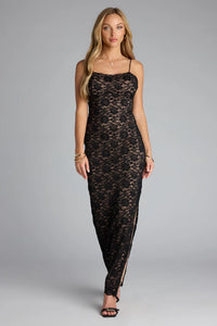 Grace the room with a long lace dress that features a sleeveless square neckline, adjustable spaghetti straps, a bold open back design, and a long-length hem accented with a high side slit. Complete formal outfit with glitter mesh heels.