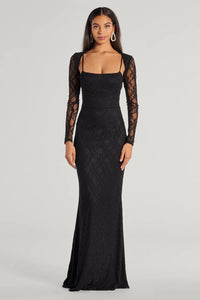 Create an elegantly chic look in the Adele mermaid dress designed with sheer lace fabric with a full-length knit lining. It features a sleeveless square neckline, adjustable spaghetti straps for a customized fit, a floor-sweeping mermaid silhouette to showcase your gorgeous curves, and a sheer lace long sleeve bolero for added coverage that can be removed.