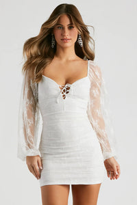 Showcase a sweet allure in this beautiful lace mini dress! It features a sweetheart neckline with a lace-up design at the bust, sheer long balloon-style sleeves with cinched hems, ruched detailing down the side and back seams, and a mini-length hem with a curve-hugging silhouette. The partially lined lace fabric features a dainty floral embroidered pattern. Perfect for brides, style with stilettos for your engagement party or bridal shower!