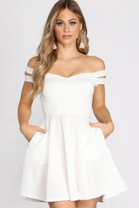Give It A Spin Off Shoulder Pleated Skater Dress