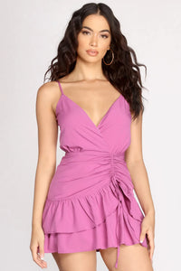 Impress in an asymmetrical mini dress that showcases curves in all the right places. The dress features a sleeveless wrap V-neckline, subtle ruching throughout, and an asymmetrical mini-length silhouette. Complete your GNO outfit with open-toe mules and sleek extra-large hoops.