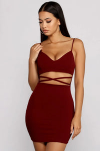 This sultry sleeveless mini dress will be your new go-to night-out look! It features adjustable spaghetti straps, a scoop neckline, a waist cutout with a tie-front accent, ruched detailing, and a short, curve-hugging silhouette. Complete the outfit with sleek hoop earrings and a chic clutch.