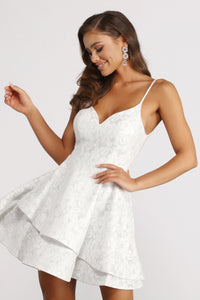 Glow up in a formal glitter dress that is fit for a queen. Make a mesmerizing impression at homecoming in our Heather dress that features a plunging v-neckline, a floral lace fabric with glitter accents, and a twirl-worthy tiered skater silhouette. Complete your elegant look with rhinestone heels and fringe duster earrings.