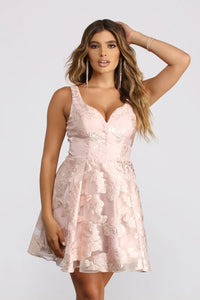 Charm in a floral dress to create a romantic vibe for a memorable date night or for the blushing bride at her bridal shower. Heather features a flattering V-neckline, a burnout floral print, and trendy side pockets to pose with. Complete your unforgettable look with rhinestone earrings and matching rhinestone bracelet.