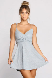 Create a glowing moment in a glitter dress that radiates with each step. The dress features a wrap V-neckline, a daring partially open back with a rhinestone embellished bar strap, and a flirty skater silhouette. Complete your night out look a sleek updo and chrome heels.