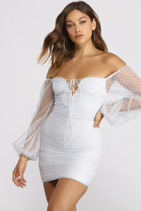 Bring the charm in a dotted mini dress to make a flirty impression. The dress features an off the shoulder neckline, sheer long sleeves with a swiss dot pattern and a ruched silhouette throughout. Complete your date night ready look with extra-large hoops and sleek stilettos.